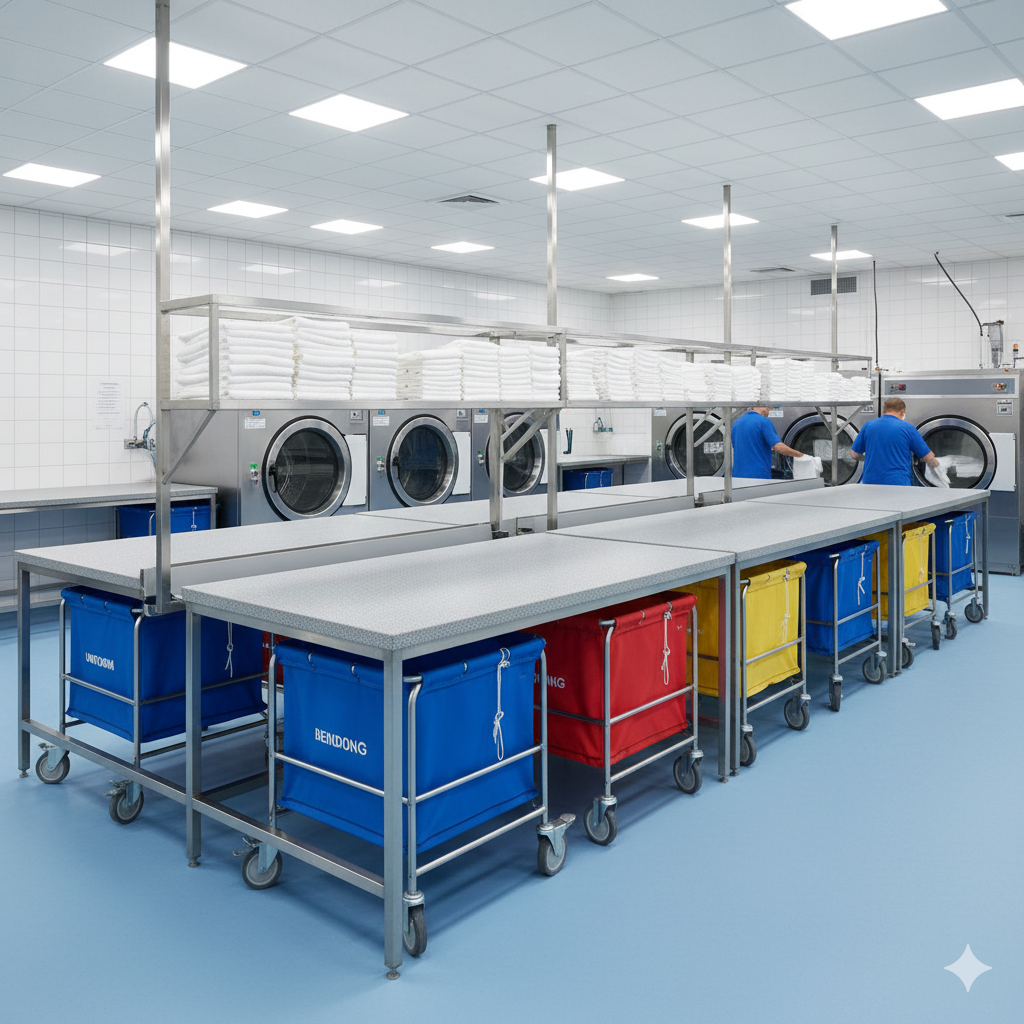 Durable stainless steel sorting tables designed for fast, hygienic, and organized handling of laundry in commercial facilities.