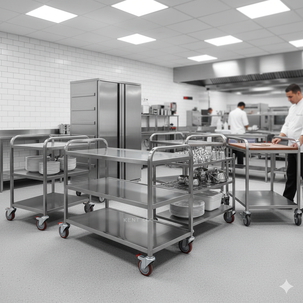Ideal for restaurants, hotels, bakeries, catering services, and food production units, these trolleys ensure safe and efficient transport of trays, dishes, ingredients, utensils, and equipment.